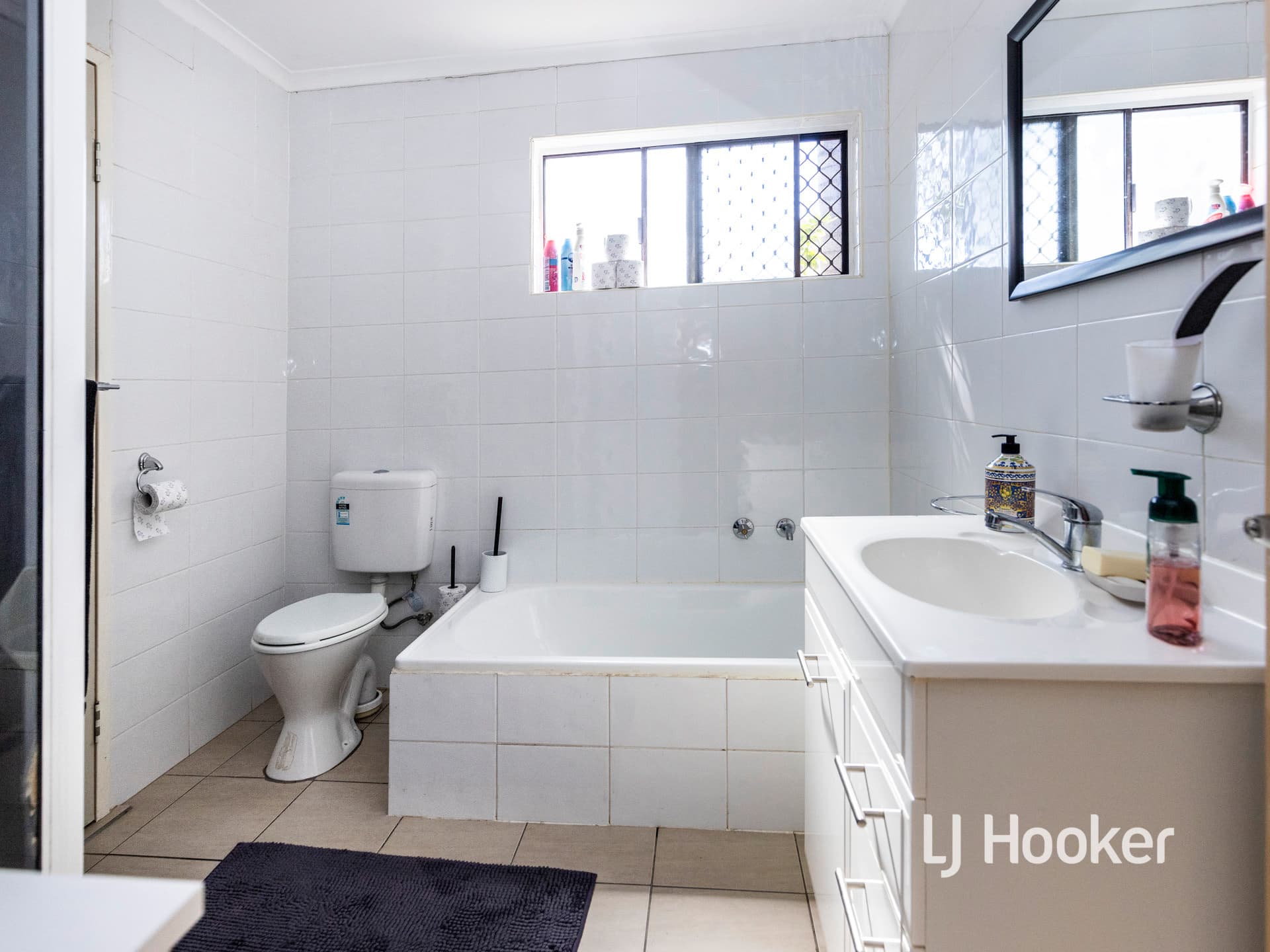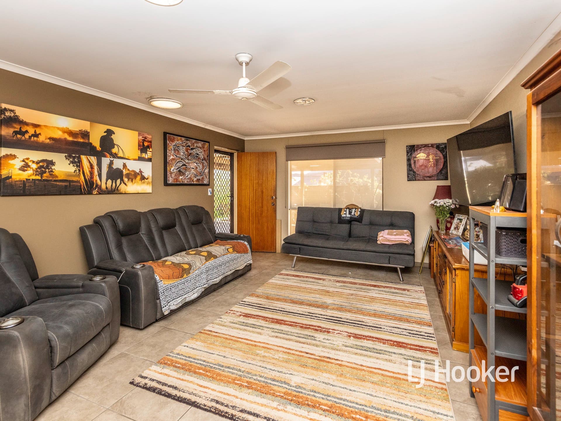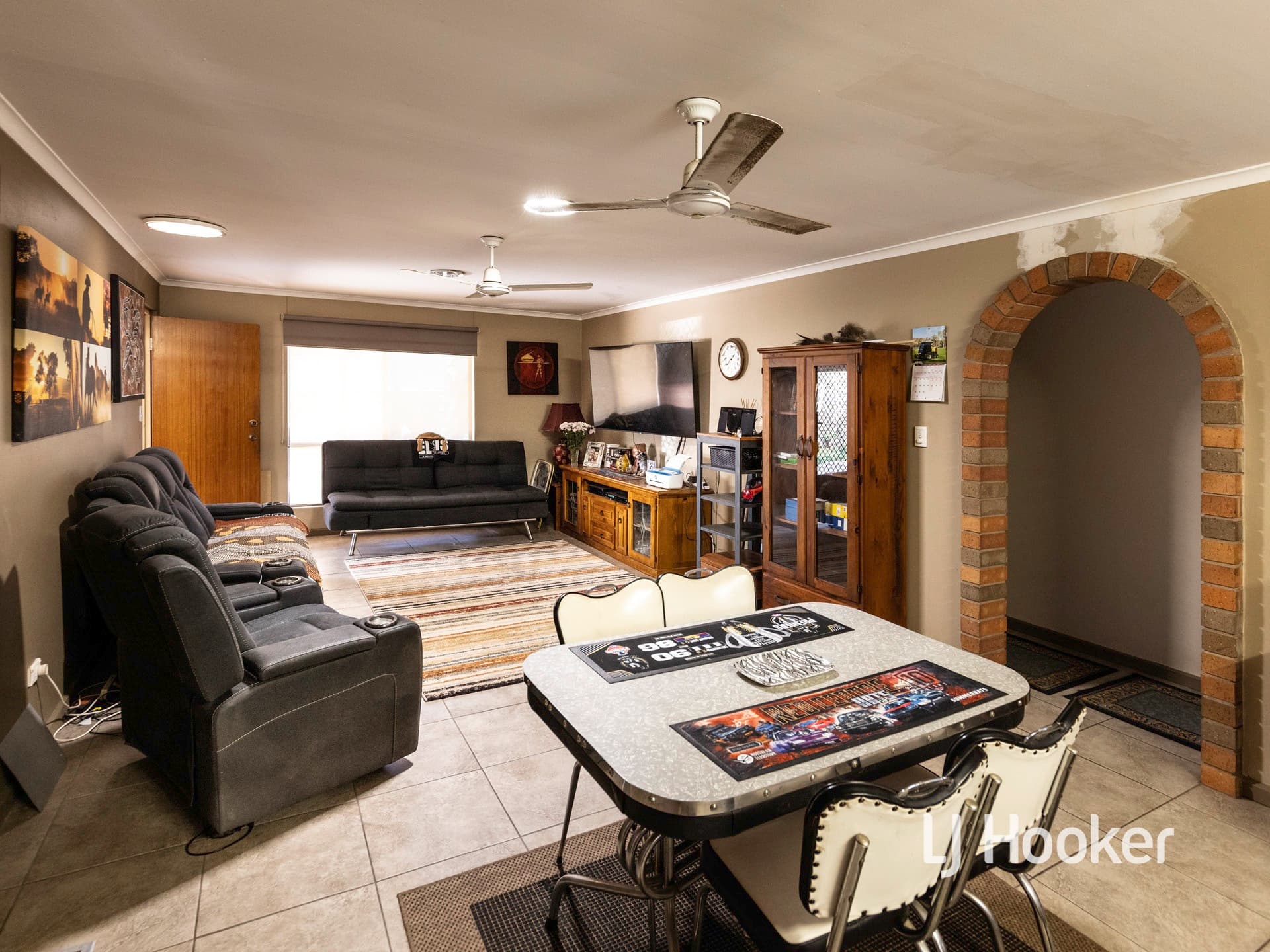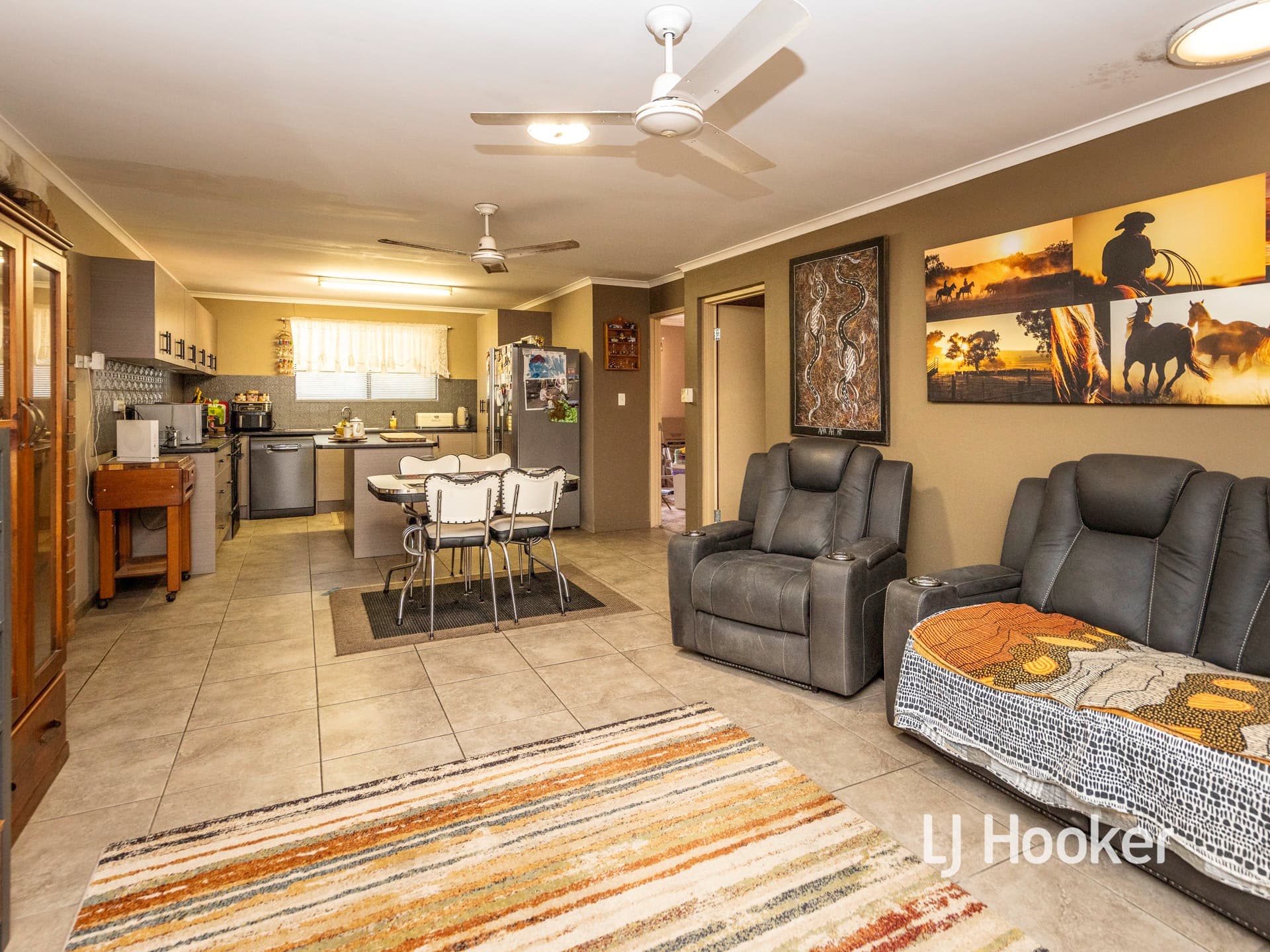 Ceramic floor tiles span the attractive living, dining and kitchen areas. Complimentary neutral decor adds an ambience to the selected paint colours and window dressings.